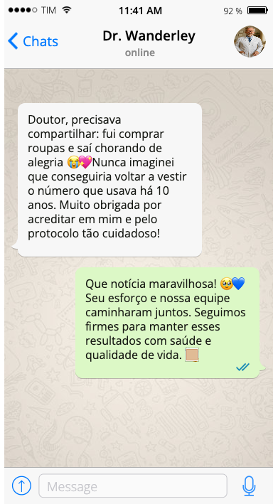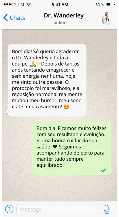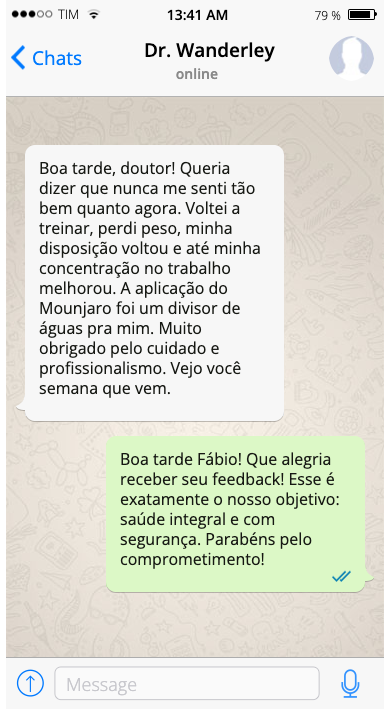 Você terá consultas de retorno semanais (de acordo com o plano), onde o Dr. Wanderley ajustará as doses, estratégias e avaliará sua evolução com segurança e precisão. Cada detalhe será monitorado para garantir o seu resultado.